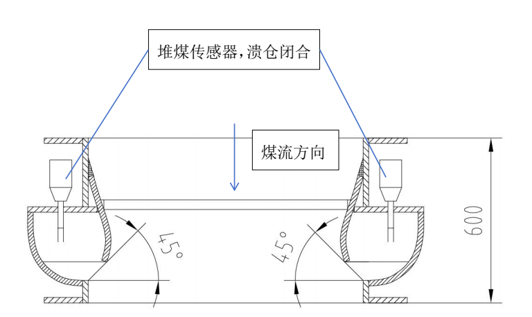 煤矿防溃仓系统闸门可以采用扇形结构或平板结构,由重型框架、具有切断和排水功能的重型闸板、大推力油缸、溃仓检测装置、排水衬板等组成。闸门框架与闸板根据煤仓内全部为水的情况下设计强度,采用箱型结构,整体密封,衬板与闸板设置排水孔,闸板前端设置锯齿状刃口,设置溃仓检测装置、集水排水口、大直径油缸。上述措施确保闸门框架在极端情况下不变形,避免出现闸门无法关闭现象。在闸门长时间关闭时,仓内积水可以经过衬板、闸板排水孔渗出,经集水排水孔在定点排出。溃仓检测装置采用流体力学设计,正常出煤时物料不会进入检测装置,不会触发传感器;当物料变成流体时会进入检测装置,触发传感器,控制闸板自动关闭并发出声光报警。